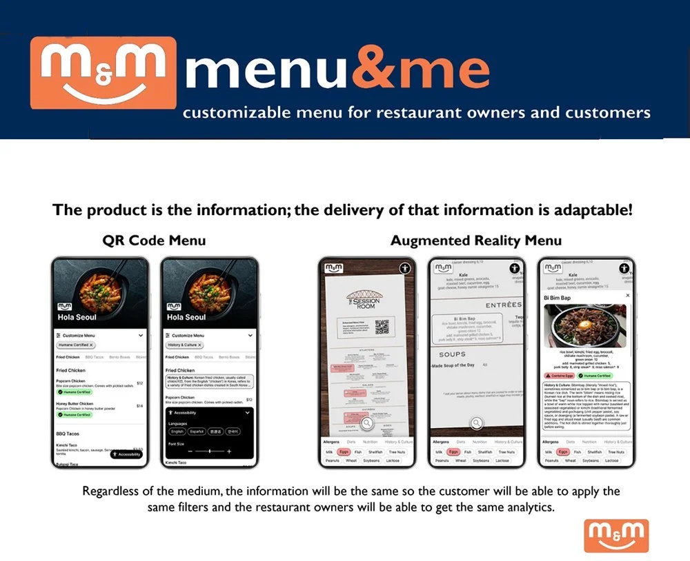 “Menu&Me allows restaurant-goers to have a more tailored food experience and restaurant owners to learn more about who eats in their restaurant by creating customizable menus for both owners and customers. The digital menu tool provides insights into a restaurant's ingredients, supply chain, treatment of workers, and other concerns, allowing restaurant owners to gain insights into customer behaviors and customers to make informed decisions about where and what they eat.”
